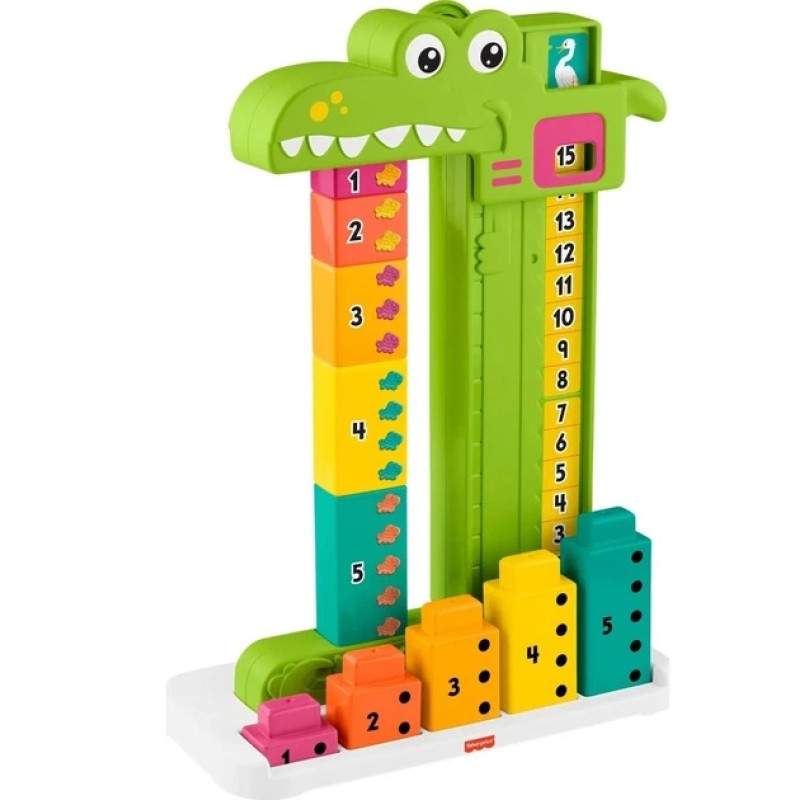 Rotaļlieta sastāv no 10 klucīšiem, kurus var ērti uzglabāt aligatora pamatnē. Izturīgie un spilgtie klucīši abās pusēs ir ar cipariem, zivtiņām vai punktiem, kas palīdz bērniem attīstīt skaitīšanas prasmes.