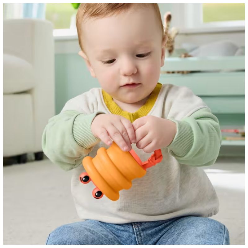 • Salokāms: rotaļlieta saspiežas un “noklikšķ”, veicinot dzirdes attīstību un ziņkāri.