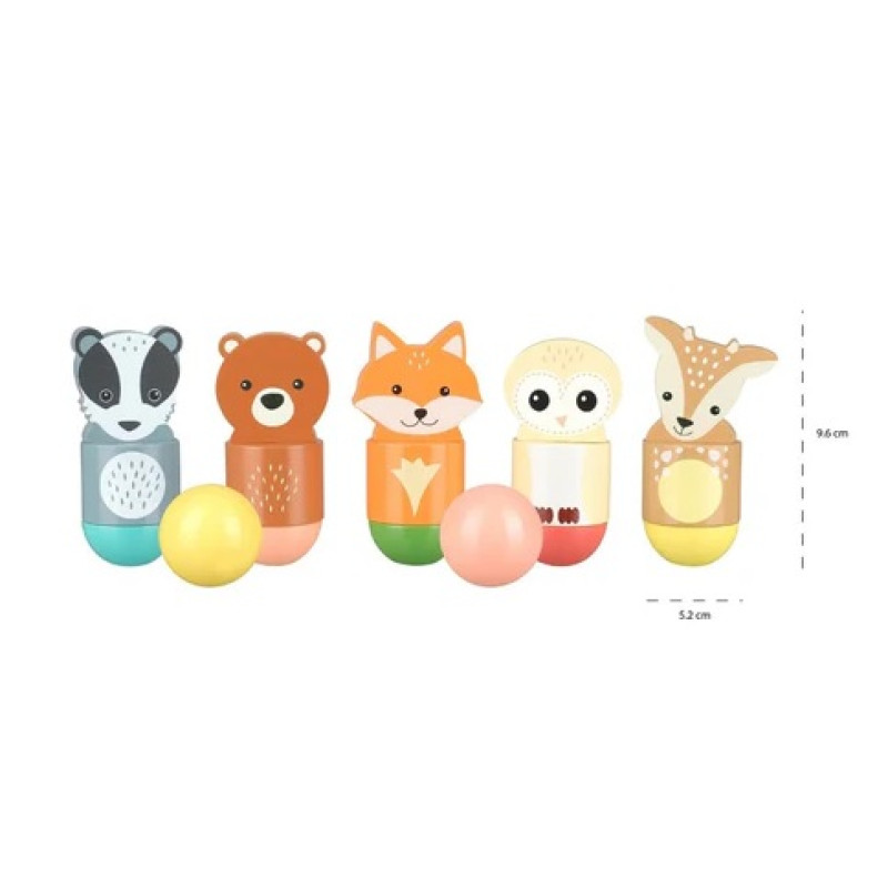 Komplektā ietilpst 5 koši krāsoti meža tēli un krāsaina koka bumbiņa. Bērni varēs stundām ilgi izklaidēties, nogāžot figūriņas un atkal tās sakārtojot rindā.