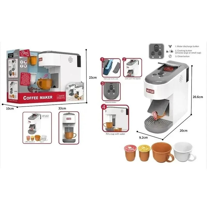 Spēles laikā kafijas aparāts tiek izgaismots ar spilgtu gaismu, atskaņo raksturīgas skaņas un pat lej īstu ūdeni! Tāpēc spēle ar šo kafijas aparātu būs ne tikai jautra, bet arī maksimāli reālistiska.