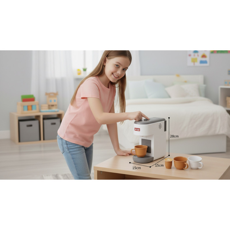 Šis spēles komplekts ne tikai lieliski papildinās bērnu virtuvi, bet arī ļaus atvērt savu mazo kafejnīcu, jo tajā ir viss nepieciešamais – kafijas aparāts, kafijas kapsulas un krūzītes.