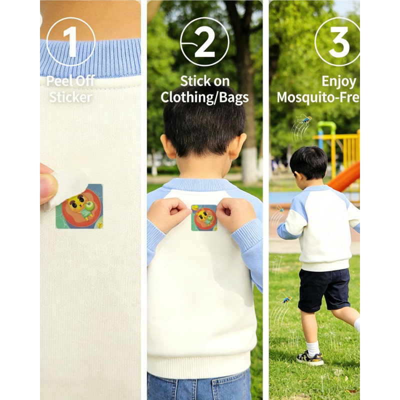 Vienkārši pielīmējiet uzlīmi pie apģērba, ratiņiem, mugursomas vai gultiņas — nav nepieciešams uzklāt krēmus vai aerosolus uz ādas.
