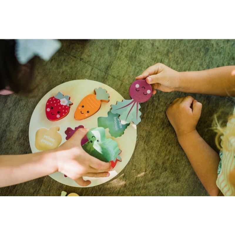 Komplektā ir 6 dažādi koši dārzeņi. Šis sorteris palīdz bērniem apgūt krāsas, kā arī attīstīt formu, izmēru un krāsu atpazīšanas prasmes.