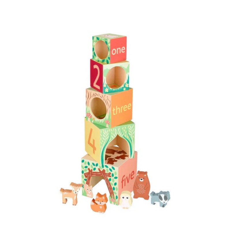 Brīnišķīgs koka klucīšu komplekts, kur katrs klucītis ir numurēts no 1 līdz 5 un dekorēts ar meža dzīvnieku ilustrācijām. Katrs klucītis ir arī iekļauj mazu koka dzīvnieka figūriņu.