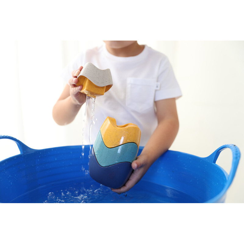 Piramīda ir viegli saliekama. Koša un krāsaina, tā ir ideāli piemērota rotaļām vannā, dārzā vai pludmalē. Krāsu un tekstūru daudzveidība palīdz stimulēt bērna uztveri.