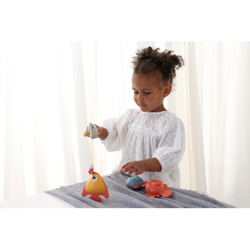 Šī vannas rotaļlieta sagādās jūsu mazulim daudz prieka. Iemetiet āķi, noķeriet zivtiņu un velciet to aiz aukliņas. Iegremdējiet zivtiņu ūdenī un vērojiet, kā tā sāk pūst burbulīšus. Komplektā ir arī jauks magnētiskais tārpiņš, kas palīdzēs pievilināt zivtiņu.
