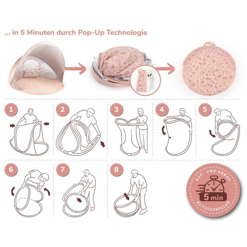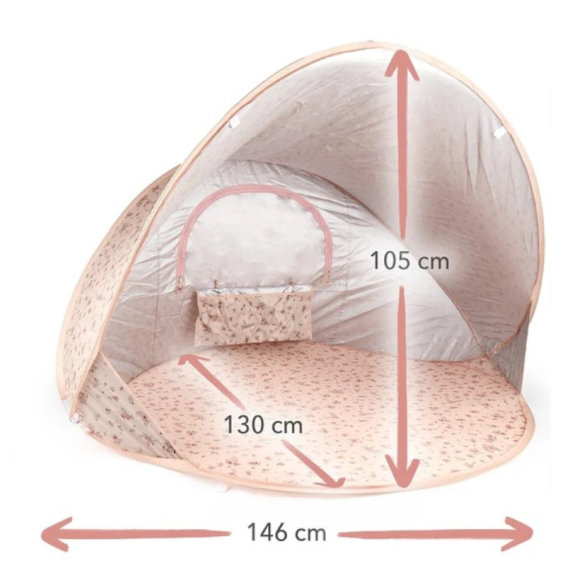 Pludmales telts “Dreamy Flowers” ar UV aizsardzību 40+ ir stilīgs sabiedrotais pludmalē, dārzā vai parkā. Tā uzceļama dažu sekunžu laikā un aizsargā no saules un vēja. Komplektā iekļautie pieci mietiņi un nostiprinājuma auklas nodrošina stabilu piestiprināšanu pie zemes. Telti var ērti salocīt un pārnēsāt komplektam pievienotajā glabāšanas somā.