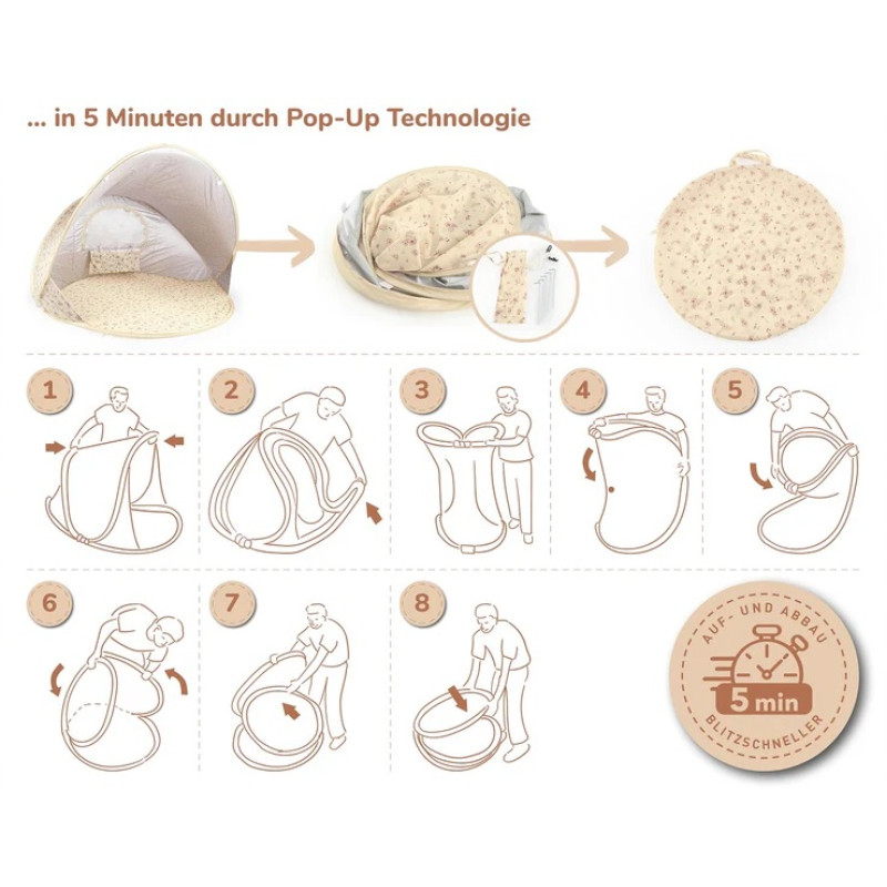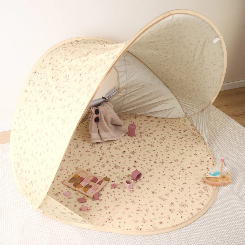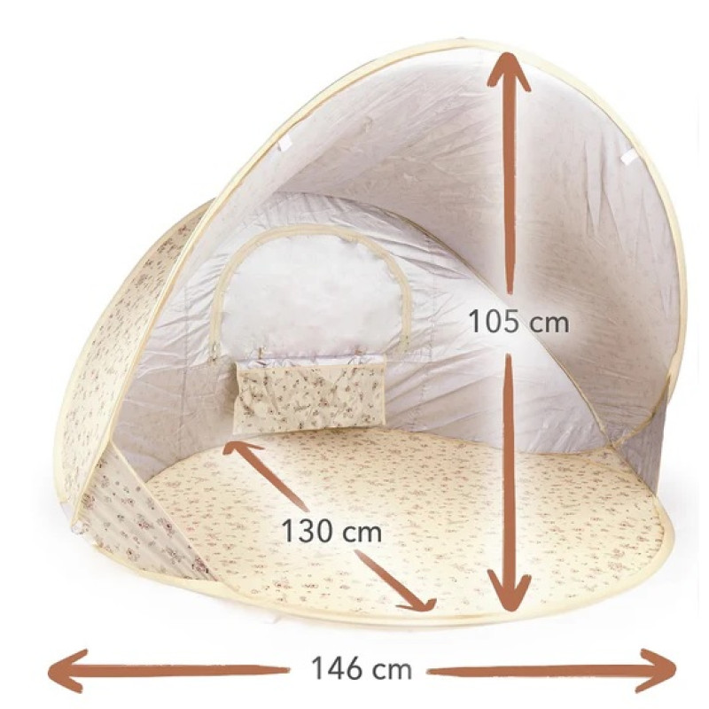Pludmales telts “Dreamy Flowers” ar UV aizsardzību 40+ ir stilīgs sabiedrotais pludmalē, dārzā vai parkā. Tā uzceļama dažu sekunžu laikā un aizsargā no saules un vēja. Komplektā iekļautie pieci mietiņi un nostiprinājuma auklas nodrošina stabilu piestiprināšanu pie zemes. Telti var ērti salocīt un pārnēsāt komplektam pievienotajā glabāšanas somā.