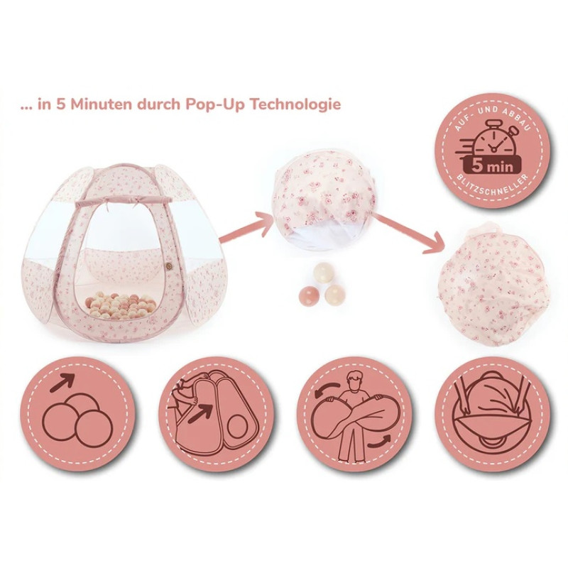 Ideāla 2-in-1 kombinācija — spēļu telts un sauso bumbiņu baseins jautrām rotaļām, kustībām un paslēpēm! Spēle ar 50 iekļautajām bumbiņām veicina bērna krāsu uztveres un motorikas attīstību. Telts ieeju var atvērt un aizvērt ar lentītēm. Salokāmā Pop-Up telts uzceļama dažu sekunžu laikā un kompakti salokāma uzglabāšanai — piemērota lietošanai gan telpās, gan ārā.
