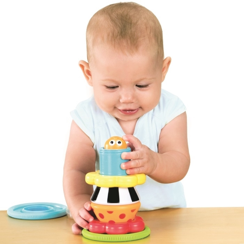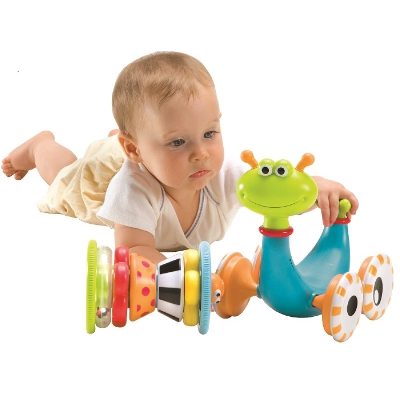 Rotaļlieta divi vienā: ripināmais "Gliemezis" un daudzkrāsainā piramīda, kas sastāv no 7 elementiem. Nospied uz astītes - gliemezis virzīsies uz priekšu. Kustības laikā skan jautra mūzika. Nospied uz zaļās pogas uz gliemeža kakla un tas apstāsies. Piramīdu-grabulīti var viegli noņemt no gliemeža un uzlikt atpakaļ. Gliemeža "Mājiņa" sastāv no dažādām atsevišķām rotaļlietām, no kurām to var sakomplektēt citā kārtībā. Jautrs purniņš-bumba, kas parādās no vienas puses, un skanīgs pīkstulis - no piramīdas! Pie katras rotaļlietas aktivizēšanas gliemezis rāpo prom apmēram 2 metru attālumā, kas stimulē bērnu kustībām "rāpot".